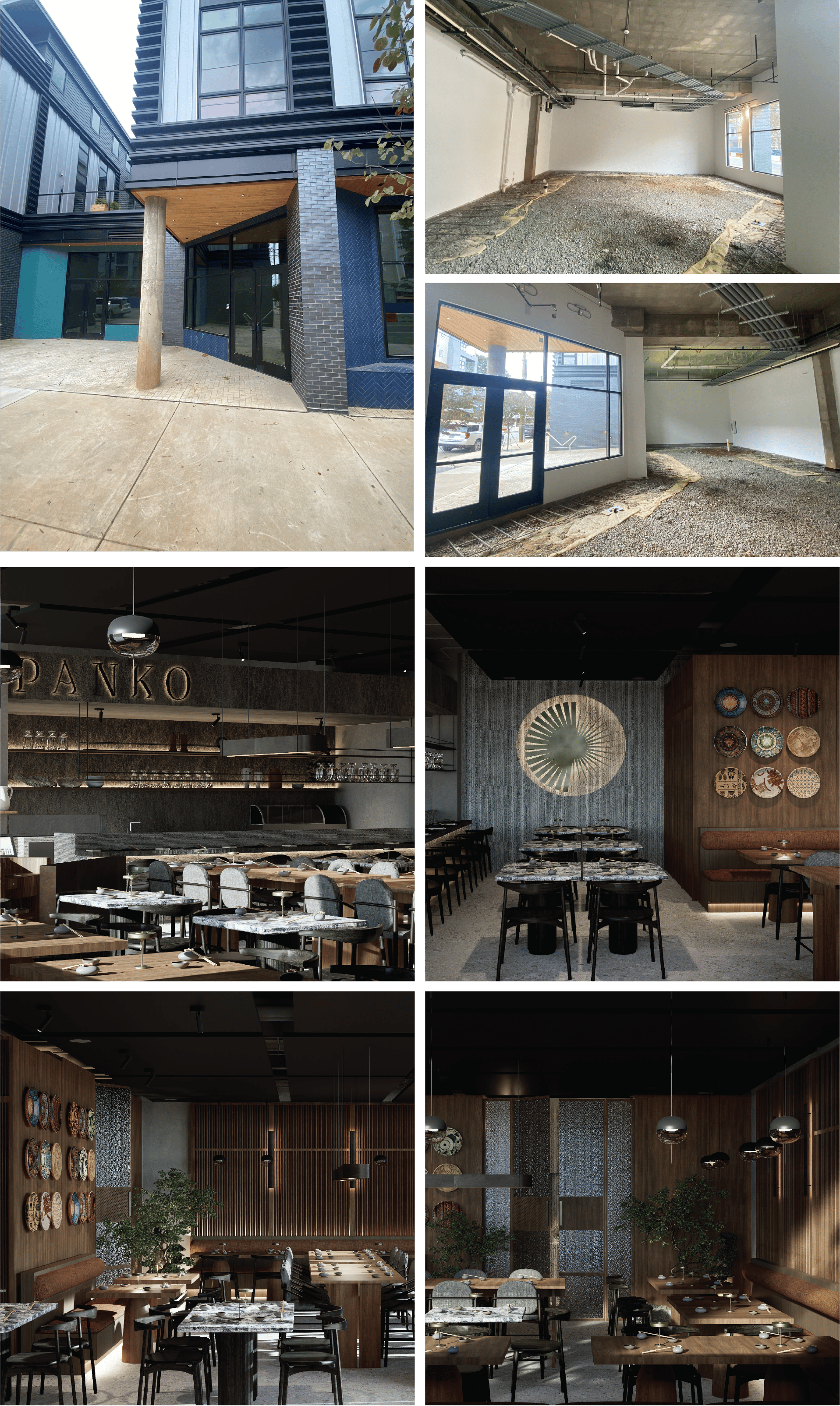 We recently designed a first-time interior change of use dark-shell upfit for a first-time restaurant Owner in Charlotte. Panko Peruvian Fusion is located on the ground floor of the Inkwell apartments on E 36th Street in NoDa in one of the multi-family's three retail shell spaces. At just over 1,700 sf of rentable space, the concept maximizes the oddly shaped suite to fit a full-service commercial kitchen, sushi bar, fixed and movable seating, and code compliant restrooms. This elevated dining experience is enhance through the curated use of natural materials that highlight culture and the flavors of the menu.
