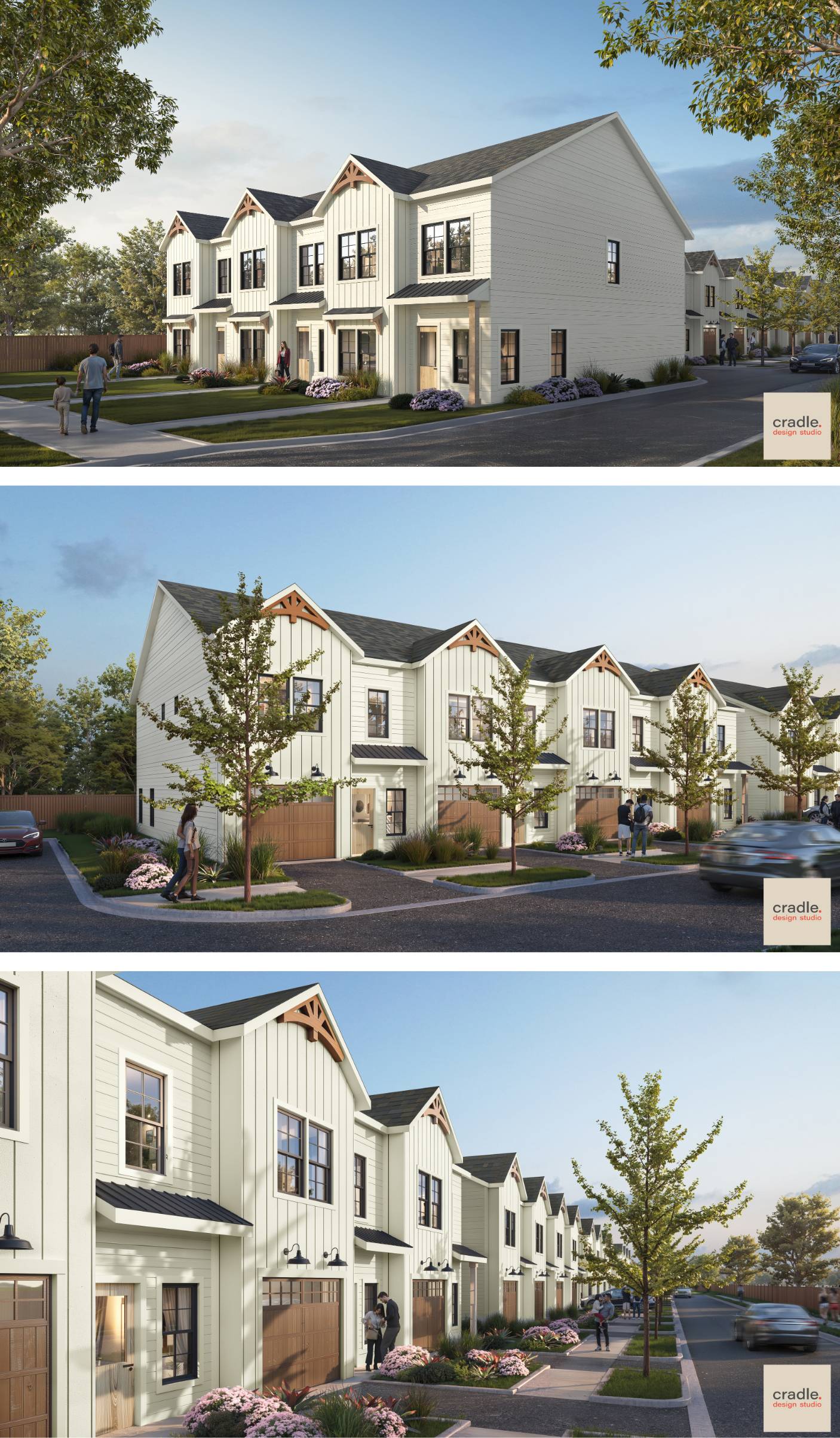 The architectural style leans contemporary, with clean rooflines, fiber cement exteriors, and warm wood accents highlighting the entries. Large windows, landscaped setbacks, and the rhythm of repeating gables create a cohesive streetscape that feels modern yet rooted in a sense of community.